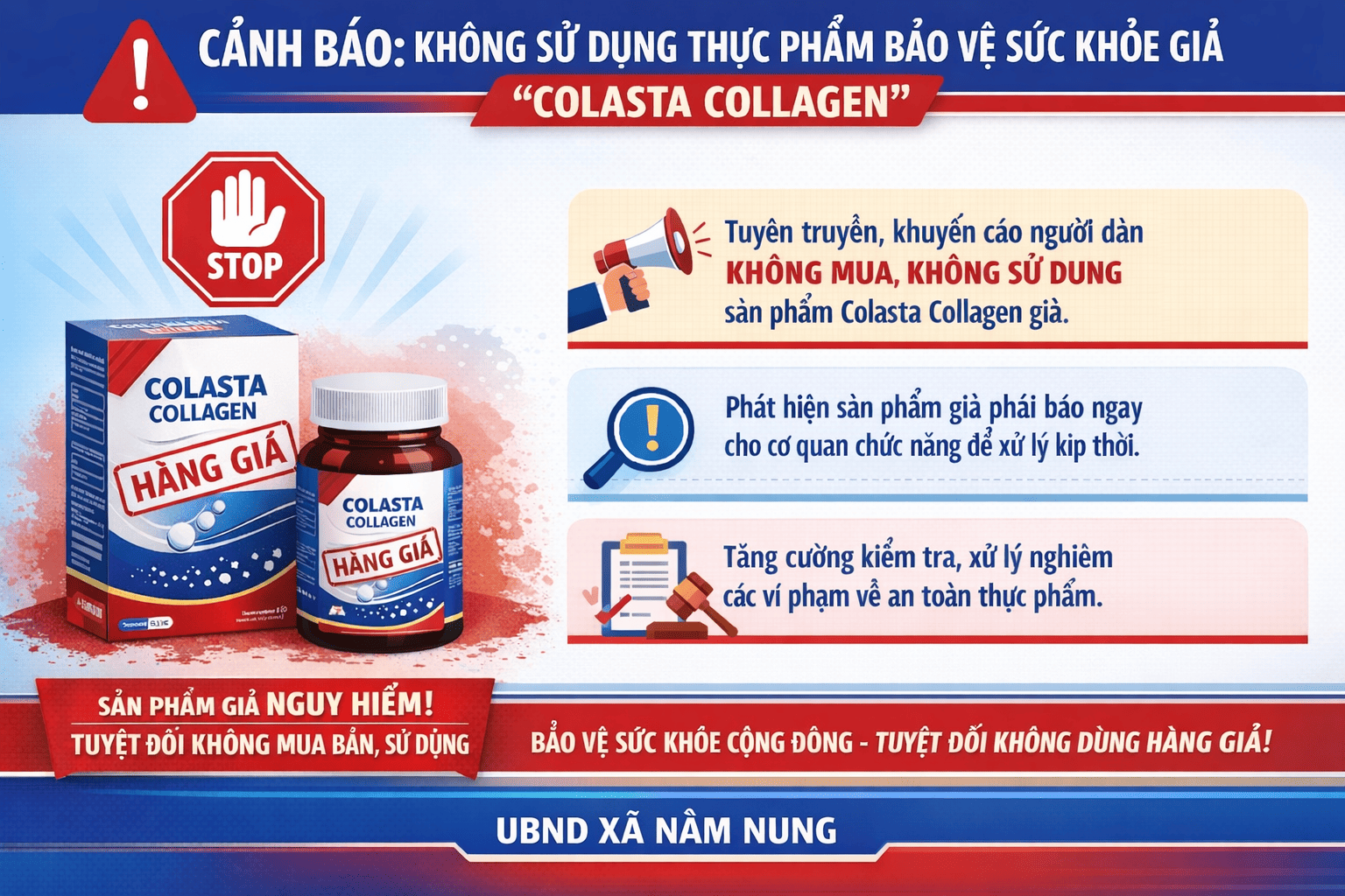 Cảnh báo thực phẩm bảo vệ sức khỏe colasta collagen là hàng giả 08:24 03/02/2026 | 126 CẢNH BÁO: THỰC PHẨM BẢO VỆ SỨC KHỎE COLASTA COLLAGEN LÀ HÀNG GIẢ Sapo: Thực hiện chỉ đạo của Chi cục An toàn vệ sinh thực phẩm tỉnh Lâm Đồng, UBND xã Nâm Nung thông tin và khuyến cáo Nhân dân trên địa bàn không mua, không sử dụng, không kinh doanh sản phẩm thực phẩm bảo vệ sức khỏe Colasta Collagen do được xác định là hàng giả, tiềm ẩn nguy cơ ảnh hưởng đến sức khỏe người tiêu dùng. Theo Công văn của Cục An toàn thực phẩm (Bộ Y tế), sản phẩm thực phẩm bảo vệ sức khỏe Colasta Collagen hiện đang lưu thông trên thị trường không bảo đảm nguồn gốc, chất lượng, có dấu hiệu là hàng giả và đang được các cơ quan chức năng tiếp tục điều tra, xử lý theo quy định của pháp luật. Nhằm bảo đảm an toàn sức khỏe Nhân dân, UBND xã Nâm Nung đề nghị người dân trên địa bàn nâng cao cảnh giác, chủ động phòng ngừa, thực hiện nghiêm các nội dung sau: Không mua, không sử dụng, không kinh doanh sản phẩm thực phẩm bảo vệ sức khỏe Colasta Collagen dưới mọi hình thức cho đến khi có thông báo hoặc kết luận chính thức của cơ quan chức năng. Chỉ lựa chọn sử dụng các sản phẩm thực phẩm bảo vệ sức khỏe có nguồn gốc xuất xứ rõ ràng, được cơ quan có thẩm quyền cấp phép lưu hành. Cảnh giác với các hình thức quảng cáo sai sự thật, thổi phồng công dụng sản phẩm trên mạng xã hội, website, sàn thương mại điện tử. Trường hợp phát hiện sản phẩm Colasta Collagen nghi là hàng giả đang lưu thông, buôn bán trên địa bàn, đề nghị Nhân dân kịp thời phản ánh về UBND xã Nâm Nung hoặc Chi cục An toàn vệ sinh thực phẩm tỉnh Lâm Đồng để phối hợp kiểm tra, xử lý theo quy định. Việc chủ động phát hiện, ngăn chặn và tố giác các hành vi sản xuất, kinh doanh thực phẩm giả, kém chất lượng là trách nhiệm của mỗi người dân, góp phần bảo vệ sức khỏe cộng đồng và giữ gìn trật tự thị trường trên địa bàn. Nguồn: Chi cục An toàn vệ sinh thực phẩm tỉnh Lâm Đồng Ngày đăng: 03/02/2026 Đơn vị thực hiện: UBND xã Nâm Nung