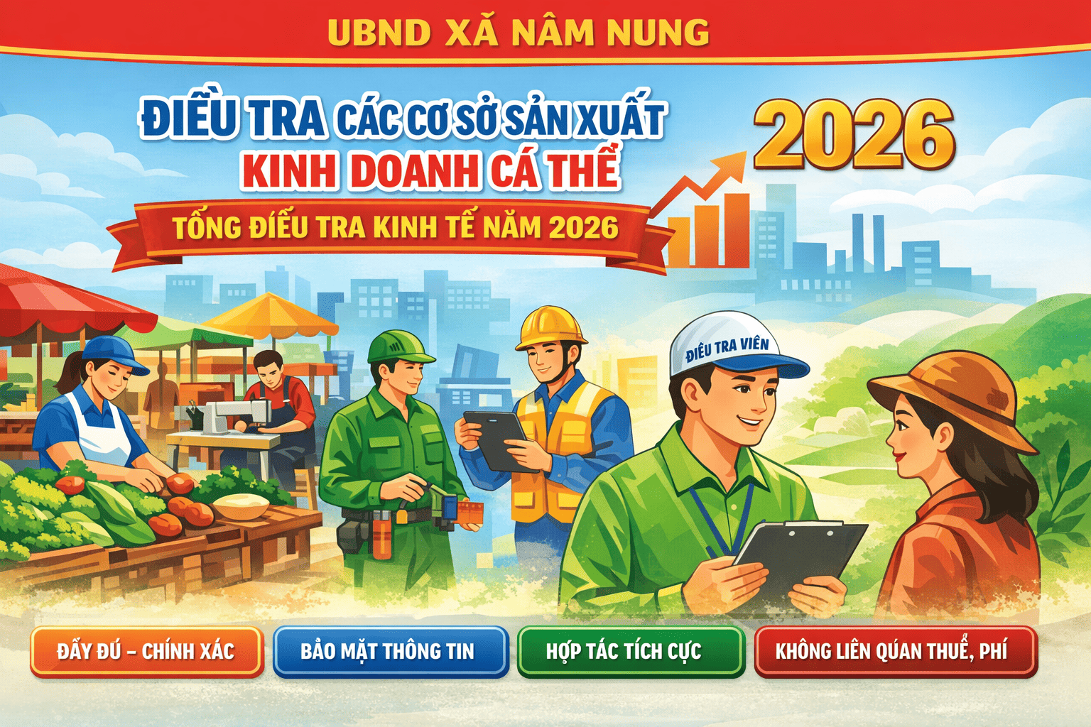 UBND xã Nâm Nung triển khai điều tra các cơ sở sản xuất, kinh doanh cá thể phục vụ tổng điều tra kinh tế năm 2026 08:32 06/01/2026 | 12 UBND XÃ NÂM NUNG TRIỂN KHAI ĐIỀU TRA CÁC CƠ SỞ SẢN XUẤT, KINH DOANH CÁ THỂ PHỤC VỤ TỔNG ĐIỀU TRA KINH TẾ NĂM 2026 Thực hiện Công văn số 4025/UBND-KTTH ngày 24/9/2025 của UBND tỉnh Lâm Đồng về việc tổ chức thực hiện Tổng điều tra kinh tế năm 2026; Công văn số 367/TKT-DVG ngày 25/9/2025 của Cục Thống kê tỉnh Lâm Đồng và Quyết định số 856/QĐ-UBND ngày 30/12/2025 của Chủ tịch UBND xã Nâm Nung về việc thành lập Ban Chỉ đạo Tổng điều tra kinh tế năm 2026, Ủy ban nhân dân xã Nâm Nung thông báo triển khai điều tra các cơ sở sản xuất, kinh doanh cá thể trên địa bàn xã, cụ thể như sau: 1. Mục đích, ý nghĩa Tổng điều tra kinh tế năm 2026 nhằm thu thập thông tin đầy đủ, chính xác về các cơ sở kinh tế để: Đánh giá thực trạng phát triển về số lượng, quy mô, lao động, kết quả sản xuất, kinh doanh; mức độ ứng dụng công nghệ thông tin và chuyển đổi số của các cơ sở kinh tế. Phục vụ công tác quản lý, chỉ đạo, điều hành phát triển kinh tế – xã hội của các cấp chính quyền. Làm căn cứ biên soạn các chỉ tiêu thống kê quan trọng thuộc Hệ thống chỉ tiêu thống kê quốc gia, đặc biệt là GDP, GRDP. Cập nhật, xây dựng cơ sở dữ liệu phục vụ các cuộc điều tra, thống kê trong giai đoạn tiếp theo. 2. Thời gian và phạm vi điều tra Thời gian thu thập thông tin: Từ ngày 05/01/2026 đến ngày 06/02/2026. Phạm vi điều tra: Toàn bộ các cơ sở sản xuất, kinh doanh cá thể đang hoạt động trên địa bàn xã Nâm Nung. 3. Yêu cầu thực hiện Việc điều tra được tổ chức, thực hiện nghiêm túc, đúng quy định của Luật Thống kê và Phương án Tổng điều tra kinh tế năm 2026. Thông tin thu thập bảo đảm đầy đủ, chính xác, khách quan, có độ tin cậy cao và được bảo mật theo quy định. Ứng dụng công nghệ thông tin trong quá trình thu thập, tổng hợp và xử lý số liệu. 4. Trách nhiệm phối hợp Điều tra viên: Thu thập thông tin đúng đối tượng, đúng địa bàn được phân công; kịp thời báo cáo khó khăn, vướng mắc trong quá trình thực hiện. Phòng Kinh tế: Theo dõi, đôn đốc tiến độ thực hiện điều tra; tổng hợp, báo cáo UBND xã. Phòng Văn hóa – Xã hội: Tuyên truyền mục đích, nội dung, thời gian điều tra trên hệ thống truyền thanh và các phương tiện thông tin của xã. Ban Tự quản các thôn, bon: Phối hợp, hỗ trợ điều tra viên trong quá trình điều tra tại địa bàn. Công an xã: Đảm bảo an ninh, trật tự trong thời gian diễn ra điều tra. Các cơ sở sản xuất, kinh doanh cá thể: Có trách nhiệm phối hợp, cung cấp thông tin đầy đủ, trung thực theo yêu cầu của điều tra viên. Cuộc điều tra không liên quan đến việc thu các loại thuế, phí. 5. Thông tin tuyên truyền Tổng điều tra kinh tế năm 2026 là nhiệm vụ quan trọng, có ý nghĩa thiết thực trong việc xây dựng chính sách phát triển kinh tế – xã hội của địa phương. UBND xã Nâm Nung đề nghị các tổ chức, cá nhân và các cơ sở sản xuất, kinh doanh cá thể trên địa bàn xã tích cực phối hợp, tạo điều kiện thuận lợi để cuộc điều tra đạt kết quả cao. UBND XÃ NÂM NUNG
