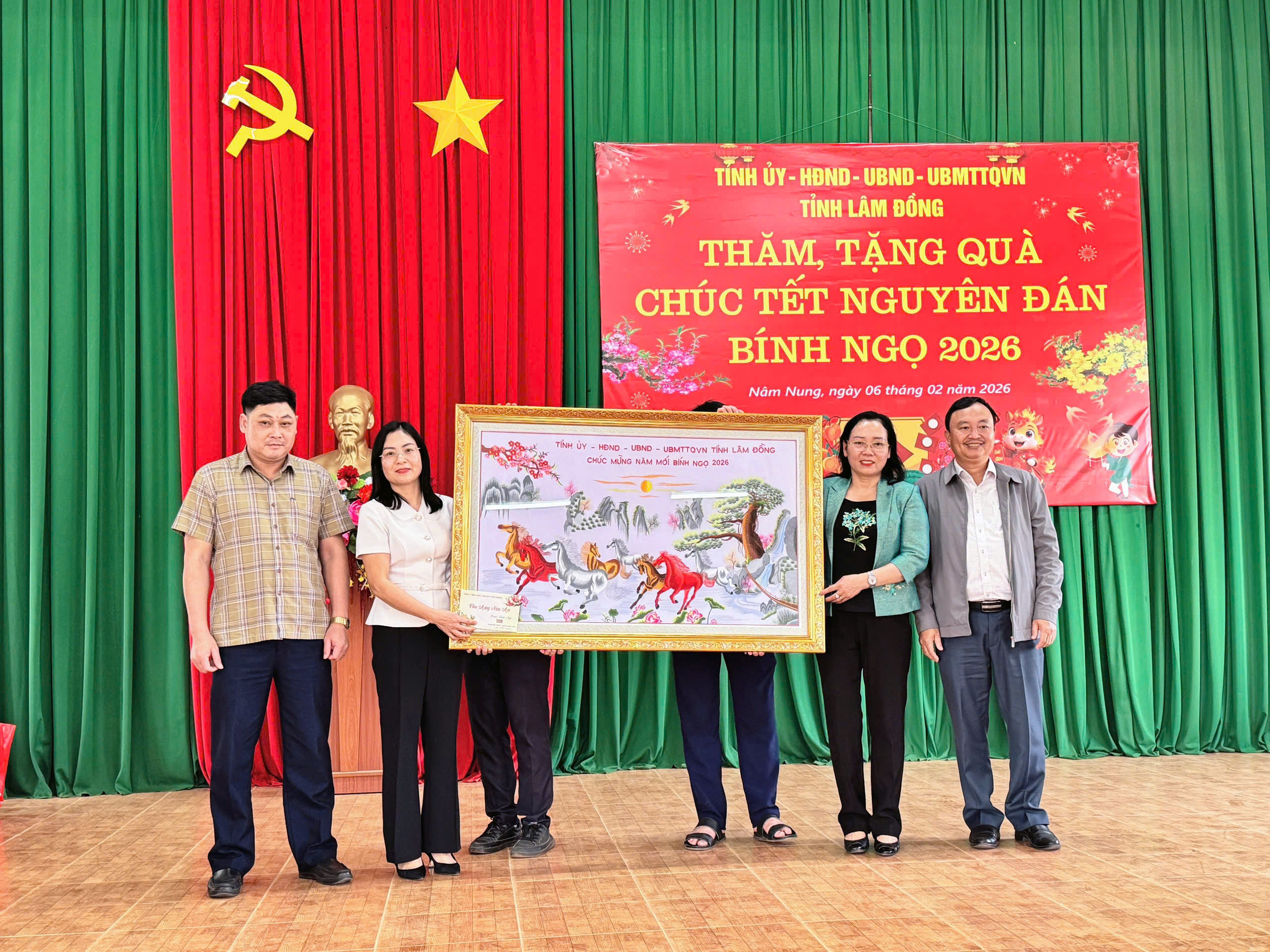 Lãnh đạo tỉnh Lâm Đồng thăm, chúc tết và tặng quà Tết Nguyên đán Bính Ngọ 2026 tại xã Nâm Nung 15:57 06/02/2026 | 66 Sáng ngày 06/02/2026, Đoàn công tác của Tỉnh uỷ - HĐND – UBND – Uỷ ban MTTQ Việt Nam tỉnh Lâm Đồng do đồng chí Mai Thị Xuân Trung – Tỉnh uỷ viên, Phó Chủ tịch HĐND tỉnh Lâm Đồng làm trưởng đoàn đã đến thăm, chúc tết và trao quà nhân dịp Tết Nguyên đán Bính Ngọ 2026 tại xã Nâm Nung. Tham gia cùng đoàn có đồng chí Tống Trường Ký – Phó Giám đốc Sở Y tế Lâm Đồng. Đón tiếp và làm việc với đoàn, về phía xã Nâm Nung có đồng chí Ngô Thu Hương – Bí thư Đảng uỷ, Chủ tịch HĐND xã; đồng chí Nguyễn Vũ Quang – Phó Chủ tịch HĐND xã; đại diện lãnh đạo các phòng, ban, đơn vị của xã. Tại chương trình, sau khi nghe lãnh đạo xã Nâm Nung báo cáo nhanh tình hình của địa phương trong năm qua; và kết quả của công tác chuẩn bị, chăm lo Tết Nguyên đán Bính Ngọ 2026 cho nhân dân tại địa phương. Đồng chí Mai Thị Xuân Trung – TUV, Phó Chủ tịch HĐND tỉnh đã thay mặt lãnh đạo tỉnh phát biểu ghi nhận và biểu dương những kết quả mà Đảng bộ, chính quyền và Nhân dân xã Nâm Nung đã đạt được trong năm qua. Đồng thời, gửi lời chúc mừng năm mới tốt đẹp nhất đến toàn Đảng bộ, chính quyền và Nhân dân xã Nâm Nung; đồng chí nhấn mạnh việc chăm lo Tết cho các đối tượng chính sách, người có uy tín, hộ nghèo là nhiệm vụ thường xuyên, thể hiện rõ tính nhân văn trong đường lối của Đảng và Nhà nước; qua đó, đề nghị cấp uỷ, chính quyền địa phương tiếp tục phát huy tinh thần đoàn kết, quan tâm đời sống Nhân dân, thực hiện hiệu quả các chính sách an sinh xã hội, nhất là tại vùng đồng bào dân tộc thiểu số Tiếp theo đó, Đoàn công tác của tỉnh đã tặng quà Tết cho hệ thống chính trị xã Nâm Nung nhằm động viên tập thể cán bộ, công chức, viên chức, những người trực tiếp thực hiện nhiệm vụ tại cơ sở. Đồng thời, trao 04 suất quà cho người có công với cách mạng; 01 suất quà cho người có uy tín tiêu biểu trong đồng bào dân tộc thiểu số và 50 suất quà cho các hộ nghèo, hộ cận nghèo trên địa bàn xã. Thay mặt địa phương, đồng chí Ngô Thu Hương – Bí thư Đảng uỷ, Chủ tịch HĐND xã đã bày tỏ lòng cảm ơn chân thành trước sự quan tâm, chăm lo kịp thời của lãnh đạo tỉnh; đây là nguồn động viên tinh thần to lớn để bà con nhân dân xã Nâm Nung vượt qua khó khăn, vươn lên trong cuộc sống. Chương trình kết thúc trong niềm vui phấn khởi, tin tưởng của người dân vào một mùa xuân mới an khang thịnh vượng. Đây là hoạt động thường niên mang đậm tính nhân văn của tỉnh Lâm Đồng, khẳng định truyền thống “tương thân tương ái” để không bất cứ người dân nào bị bỏ lại phía sau trong dịp Tết cổ truyền của dân tộc./.