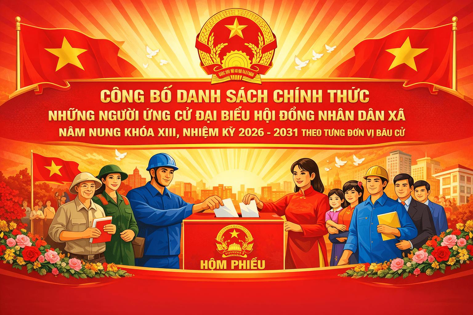 Công bố danh sách chính thức những người ứng cử đại biểu Hội đồng nhân dân xã khóa XIII, nhiệm kỳ 2026–2031 theo từng đơn vị bầu cử. 16:15 26/02/2026 | 344 XÃ NÂM NUNG CÔNG BỐ DANH SÁCH CHÍNH THỨC NHỮNG NGƯỜI ỨNG CỬ ĐẠI BIỂU HĐND XÃ KHÓA XIII, NHIỆM KỲ 2026–2031 Ngày 24/02/2026, Ủy ban Bầu cử xã Nâm Nung đã ban hành Nghị quyết số 24/NQ-UBBC về việc công bố danh sách chính thức những người ứng cử đại biểu Hội đồng nhân dân xã khóa XIII, nhiệm kỳ 2026–2031 theo từng đơn vị bầu cử. Việc công bố danh sách căn cứ trên: Luật Bầu cử đại biểu Quốc hội và đại biểu HĐND năm 2015; Luật sửa đổi, bổ sung một số điều của Luật Bầu cử ngày 24/6/2025; Nghị quyết 199/2025/QH15 của Quốc hội về việc rút ngắn nhiệm kỳ và ấn định ngày bầu cử nhiệm kỳ 2026–2031; Nghị quyết 09/NQ-UBBC ngày 23/12/2025 của UBBC xã Nâm Nung; Biên bản Hội nghị hiệp thương lần thứ ba ngày 12/02/2026 của Ủy ban MTTQ Việt Nam xã. 1. Số lượng người ứng cử và số đại biểu được bầu Tổng số người ứng cử đủ tiêu chuẩn: 37 người Tổng số đại biểu HĐND xã được bầu: 23 đại biểu Số đơn vị bầu cử trên địa bàn xã: 14 đơn vị 2. Hiệu lực thi hành Nghị quyết có hiệu lực từ ngày 24/02/2026 – thời điểm được Ủy ban Bầu cử xã Nâm Nung thông qua. Các cơ quan, đơn vị, thành viên các ban bầu cử, tổ bầu cử và các ứng cử viên chịu trách nhiệm thực hiện theo đúng quy định.