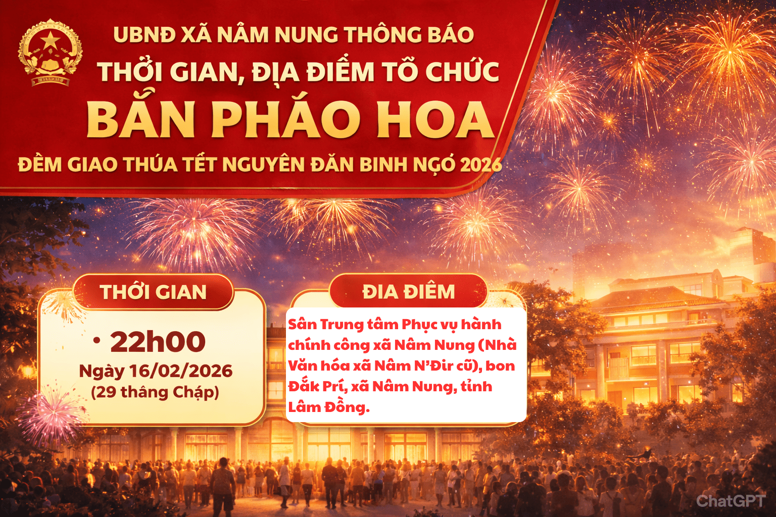 UBND xã Nâm Nung thông báo thời gian, địa điểm tổ chức bắn pháo hoa đêm giao thừa Tết Nguyên đán Bính Ngọ 2026 11:57 14/02/2026 | 70 UBND XÃ NÂM NUNG THÔNG BÁO THỜI GIAN, ĐỊA ĐIỂM TỔ CHỨC BẮN PHÁO HOA ĐÊM GIAO THỪA TẾT NGUYÊN ĐÁN BÍNH NGỌ 2026 Nhằm tạo không khí vui tươi, phấn khởi chào đón năm mới Bính Ngọ 2026; cổ vũ tinh thần đoàn kết, gắn bó cộng đồng, động viên cán bộ và Nhân dân bước vào năm mới với khí thế mới, quyết tâm mới, UBND xã Nâm Nung thông báo thời gian, địa điểm tổ chức bắn pháo hoa nổ tầm thấp đêm Giao thừa Tết Nguyên đán Bính Ngọ năm 2026 như sau: 1. Thời gian, địa điểm tổ chức Thời gian bắn pháo hoa: Bắt đầu vào lúc 22 giờ 00 phút, ngày 16/02/2026 (nhằm ngày 29 tháng Chạp năm Ất Tỵ). Thời lượng bắn: Không quá 15 phút. Địa điểm: Sân Trung tâm Phục vụ hành chính công xã Nâm Nung (Nhà Văn hóa xã Nâm N’Đir cũ), bon Đắk Prí, xã Nâm Nung, tỉnh Lâm Đồng. 2. Công tác đảm bảo tổ chức UBND xã đã phân công nhiệm vụ cụ thể cho các lực lượng, đơn vị nhằm đảm bảo chương trình diễn ra an toàn, trang trọng, đúng quy định: Ban Chỉ huy Quân sự xã chủ trì tổ chức bắn pháo hoa; phối hợp đảm bảo an toàn trận địa bắn, kiểm soát thiết bị bay không người lái; sẵn sàng lực lượng, phương tiện xử lý các tình huống phát sinh. Công an xã đảm bảo an ninh trật tự, phân luồng giao thông, phòng cháy chữa cháy; không để xảy ra ùn tắc, mất an toàn trước, trong và sau thời điểm bắn pháo hoa. Phòng Kinh tế phối hợp đảm bảo nguồn điện phục vụ chương trình. Phòng Văn hóa – Xã hội tăng cường công tác tuyên truyền trước, trong và sau Tết; phối hợp đảm bảo âm thanh, trang trí phục vụ sự kiện. Trung tâm Dịch vụ tổng hợp thực hiện tuyên truyền cổ động trực quan, ghi hình tư liệu và hỗ trợ phát sóng trực tiếp (Livestream) trên các nền tảng thông tin chính thức của xã để phục vụ Nhân dân. Bên cạnh đó, các cơ quan, đơn vị, trường học, Ban tự quản các thôn, bon tiếp tục triển khai nghiêm túc các nhiệm vụ được giao theo Kế hoạch số 36/KH-UBND ngày 30/01/2026 của UBND xã. 3. Kêu gọi Nhân dân tham gia UBND xã Nâm Nung trân trọng thông báo và kính mời toàn thể cán bộ, Nhân dân trên địa bàn xã cùng tham gia, theo dõi chương trình bắn pháo hoa đêm Giao thừa trong không khí vui tươi, an toàn, tiết kiệm và văn minh. Trong quá trình triển khai nếu có khó khăn, vướng mắc, các đơn vị kịp thời báo cáo UBND xã (qua Văn phòng HĐND&UBND xã) để được chỉ đạo, xử lý. UBND xã Nâm Nung 24-TB-UBND - thời-gian-bắn-pháo-hoa.pdf