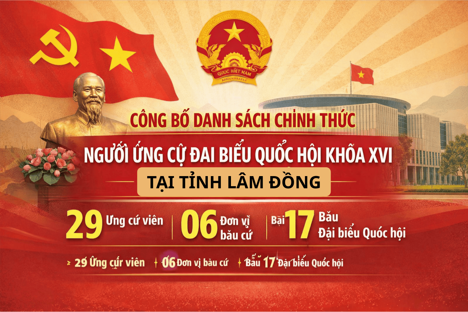 Công bố danh sách chính thức người ứng cử đại biểu Quốc hội khóa XVI tại tỉnh Lâm Đồng 09:17 26/02/2026 | 64 Công bố danh sách chính thức người ứng cử đại biểu Quốc hội khóa XVI tại tỉnh Lâm Đồng Thực hiện Nghị quyết số 151/NQ-HĐBCQG do Trần Thanh Mẫn – Chủ tịch Quốc hội ký ban hành, Hội đồng Bầu cử Quốc gia đã công bố danh sách chính thức những người ứng cử đại biểu Quốc hội khóa XVI trên phạm vi cả nước. Theo Nghị quyết, cả nước có 864 người ứng cử tại 182 đơn vị bầu cử, để bầu 500 đại biểu Quốc hội khóa XVI. Nghị quyết có hiệu lực kể từ ngày ký ban hành. Tại tỉnh Lâm Đồng, có 29 người ứng cử tại 06 đơn vị bầu cử, để bầu 17 đại biểu Quốc hội, nhiệm kỳ 2026 – 2031. Việc công bố danh sách chính thức người ứng cử là cơ sở quan trọng để cử tri nghiên cứu, tìm hiểu thông tin và thực hiện quyền, nghĩa vụ công dân trong cuộc bầu cử đại biểu Quốc hội sắp tới.