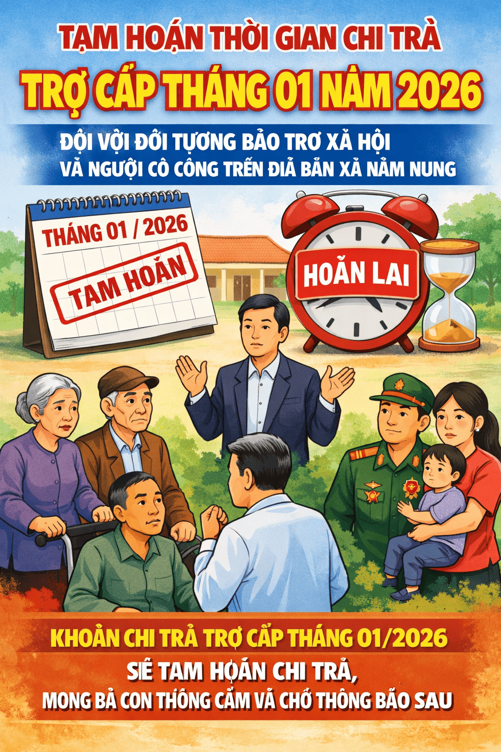 Tạm hoãn thời gian chi trả trợ cấp tháng 01 năm 2026 đối với đối tượng bảo trợ xã hội và người có công trên địa bàn xã Nâm Nung 21:22 06/01/2026 | 25 THÔNG BÁO Về việc tạm hoãn thời gian chi trả trợ cấp tháng 01 năm 2026 đối với đối tượng bảo trợ xã hội và người có công trên địa bàn xã Nâm Nung Ủy ban nhân dân xã Nâm Nung thông báo: Thực hiện công tác chi trả trợ cấp hằng tháng đối với các đối tượng bảo trợ xã hội và người có công trên địa bàn xã Nâm Nung, theo thông lệ, việc chi trả thường được tổ chức vào những ngày đầu của tháng. Tuy nhiên, trong thời gian triển khai chi trả trợ cấp tháng 01 năm 2026, hiện nay Phòng Văn hóa – Xã hội xã Nâm Nung chưa được cấp kinh phí để thực hiện việc chi trả theo quy định. Do đó, việc chi trả trợ cấp tháng 01 năm 2026 đối với đối tượng bảo trợ xã hội và người có công trên địa bàn xã Nâm Nung được tạm hoãn. Ủy ban nhân dân xã Nâm Nung đề nghị Ban tự quản 14 thôn, bon phối hợp thông tin, tuyên truyền kịp thời đến các đối tượng bảo trợ xã hội và người có công trên địa bàn mình quản lý để nắm rõ nội dung thông báo nêu trên. Thời gian tổ chức chi trả trợ cấp tháng 01 năm 2026 sẽ được UBND xã thông báo cụ thể sau khi được cấp kinh phí theo quy định. UBND xã Nâm Nung trân trọng thông báo và mong nhận được sự quan tâm, phối hợp của các thôn, bon và Nhân dân trên địa bàn xã. tạm hoãn chi trả.pdf