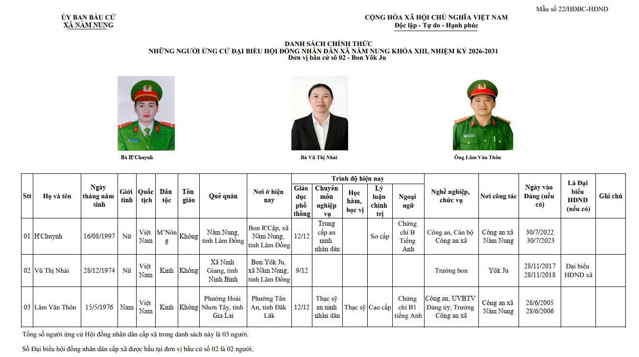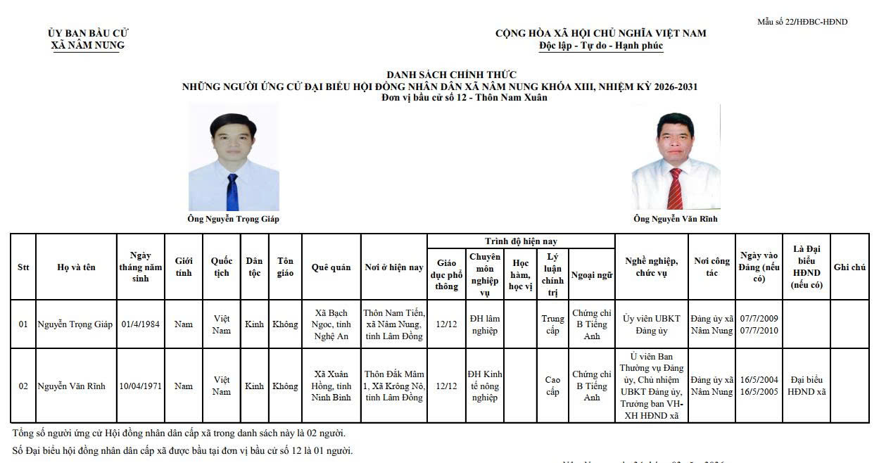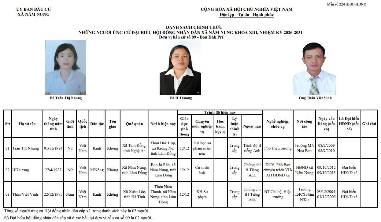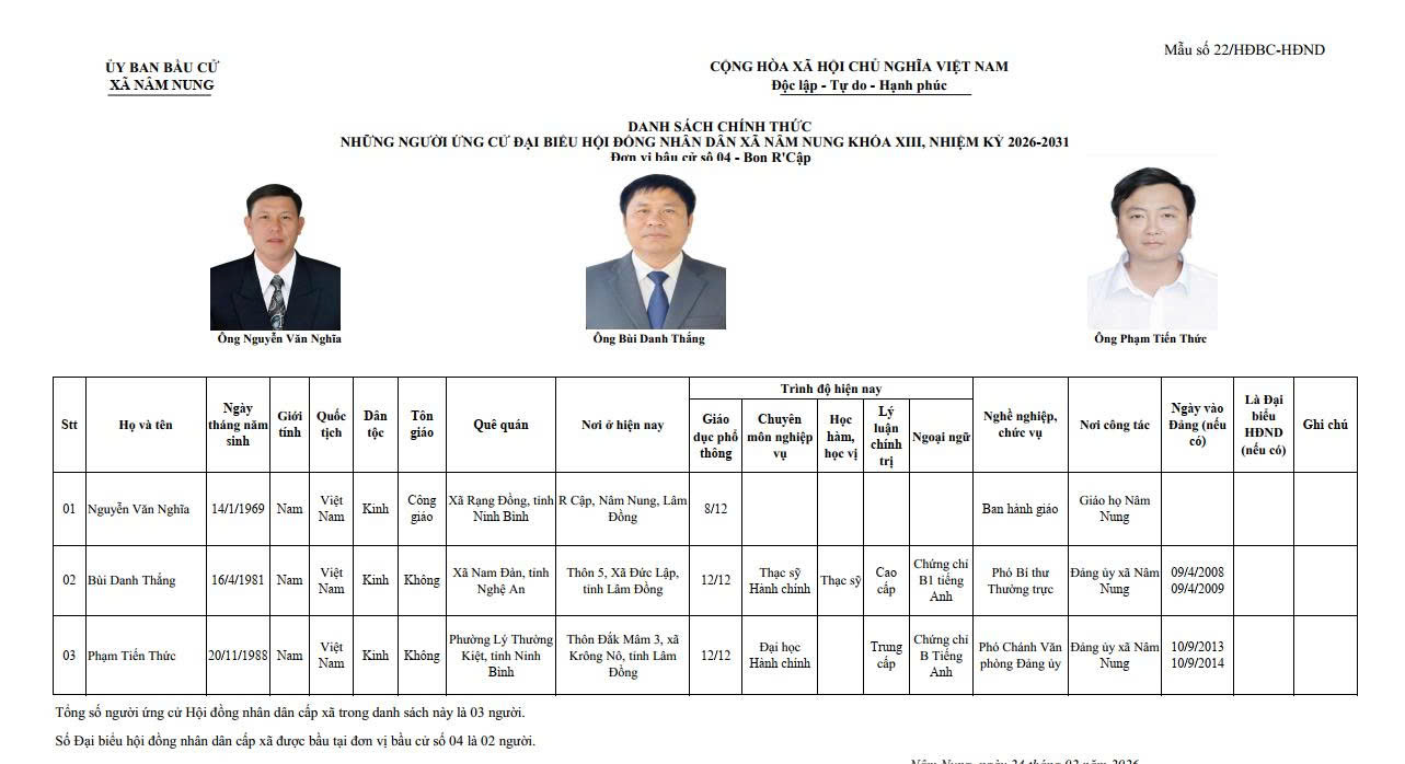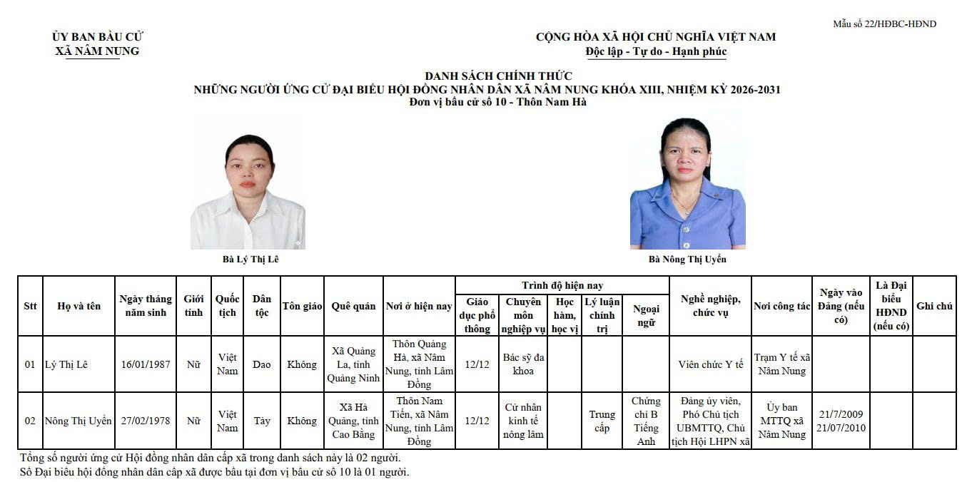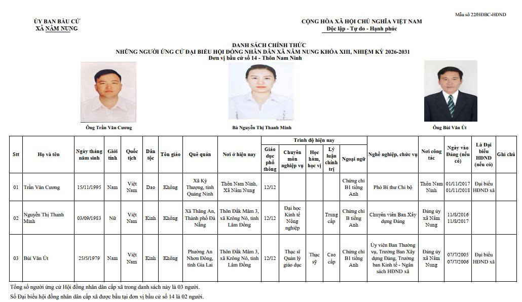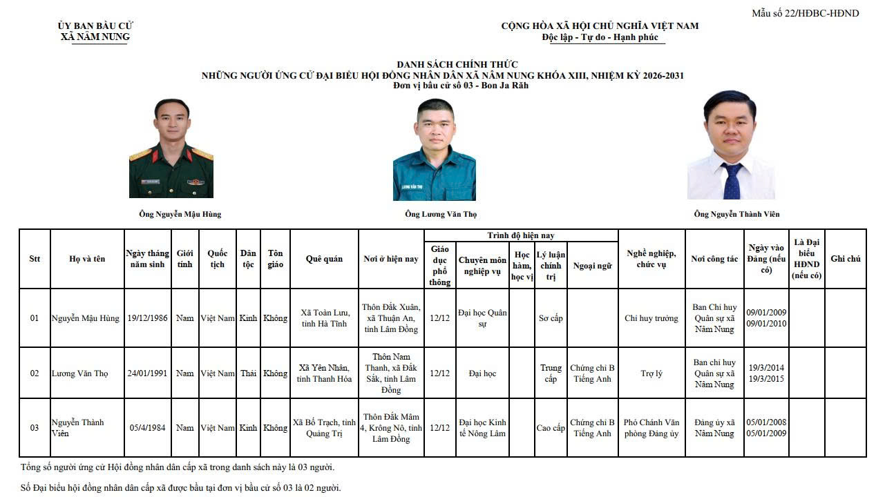 XÃ NÂM NUNG CÔNG BỐ DANH SÁCH CHÍNH THỨC NHỮNG NGƯỜI ỨNG CỬ ĐẠI BIỂU HĐND XÃ KHÓA XIII, NHIỆM KỲ 2026–2031 Ngày 24/02/2026, Ủy ban Bầu cử xã Nâm Nung đã ban hành Nghị quyết số 24/NQ-UBBC về việc công bố danh sách chính thức những người ứng cử đại biểu Hội đồng nhân dân xã khóa XIII, nhiệm kỳ 2026–2031 theo từng đơn vị bầu cử. Việc công bố danh sách căn cứ trên: Luật Bầu cử đại biểu Quốc hội và đại biểu HĐND năm 2015; Luật sửa đổi, bổ sung một số điều của Luật Bầu cử ngày 24/6/2025; Nghị quyết 199/2025/QH15 của Quốc hội về việc rút ngắn nhiệm kỳ và ấn định ngày bầu cử nhiệm kỳ 2026–2031; Nghị quyết 09/NQ-UBBC ngày 23/12/2025 của UBBC xã Nâm Nung; Biên bản Hội nghị hiệp thương lần thứ ba ngày 12/02/2026 của Ủy ban MTTQ Việt Nam xã. 1. Số lượng người ứng cử và số đại biểu được bầu Tổng số người ứng cử đủ tiêu chuẩn: 37 người Tổng số đại biểu HĐND xã được bầu: 23 đại biểu Số đơn vị bầu cử trên địa bàn xã: 14 đơn vị 2. Hiệu lực thi hành Nghị quyết có hiệu lực từ ngày 24/02/2026 – thời điểm được Ủy ban Bầu cử xã Nâm Nung thông qua. Các cơ quan, đơn vị, thành viên các ban bầu cử, tổ bầu cử và các ứng cử viên chịu trách nhiệm thực hiện theo đúng quy định.