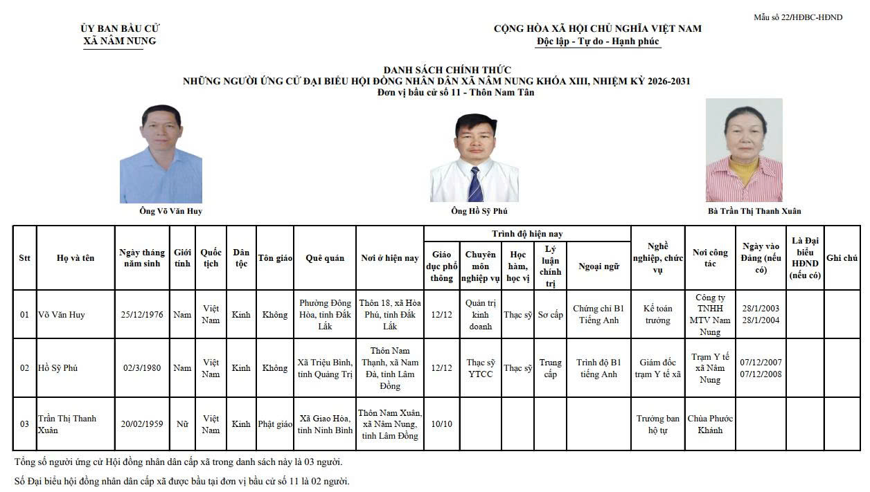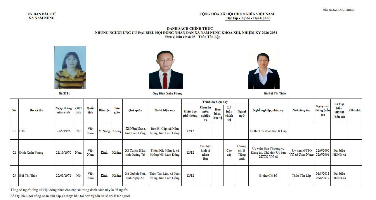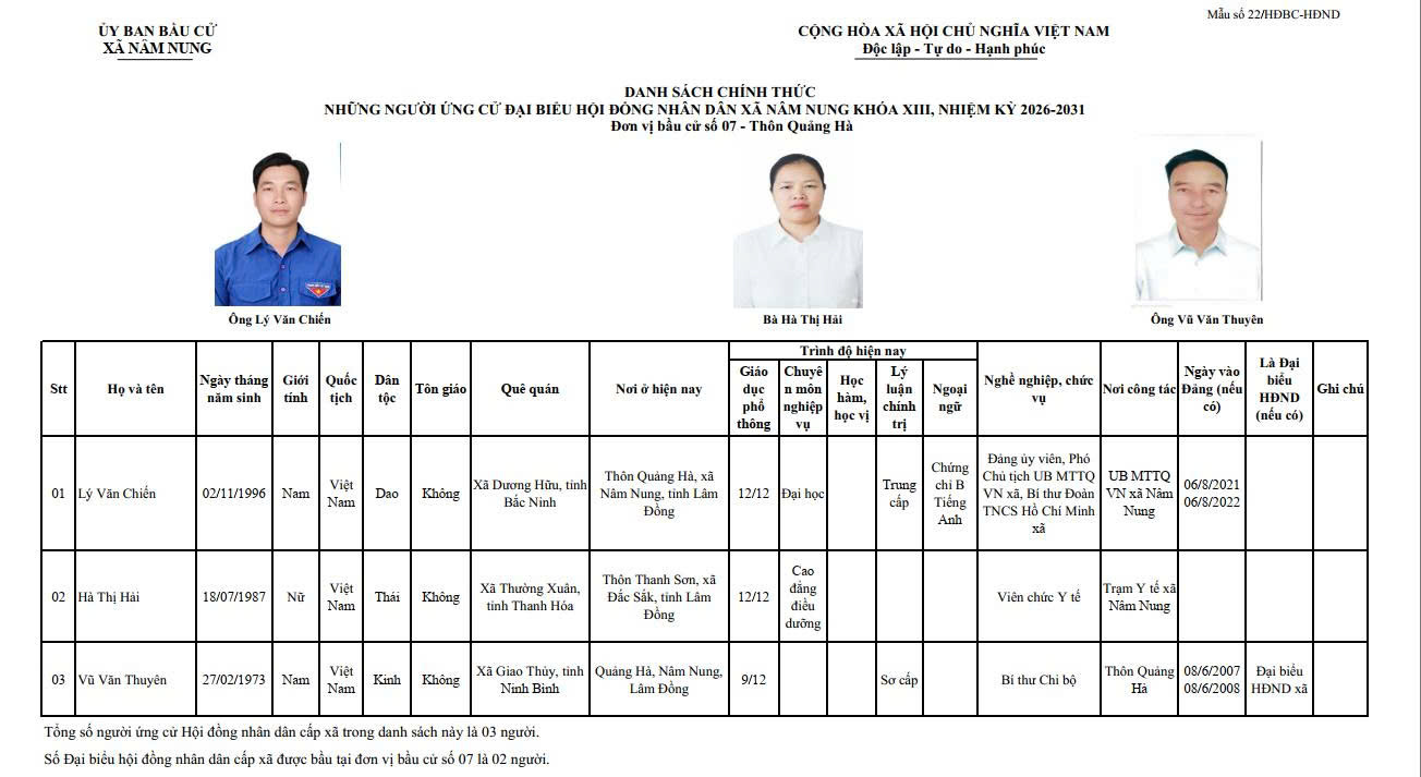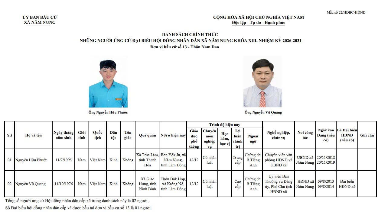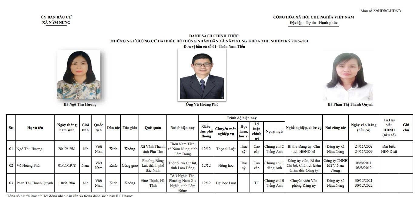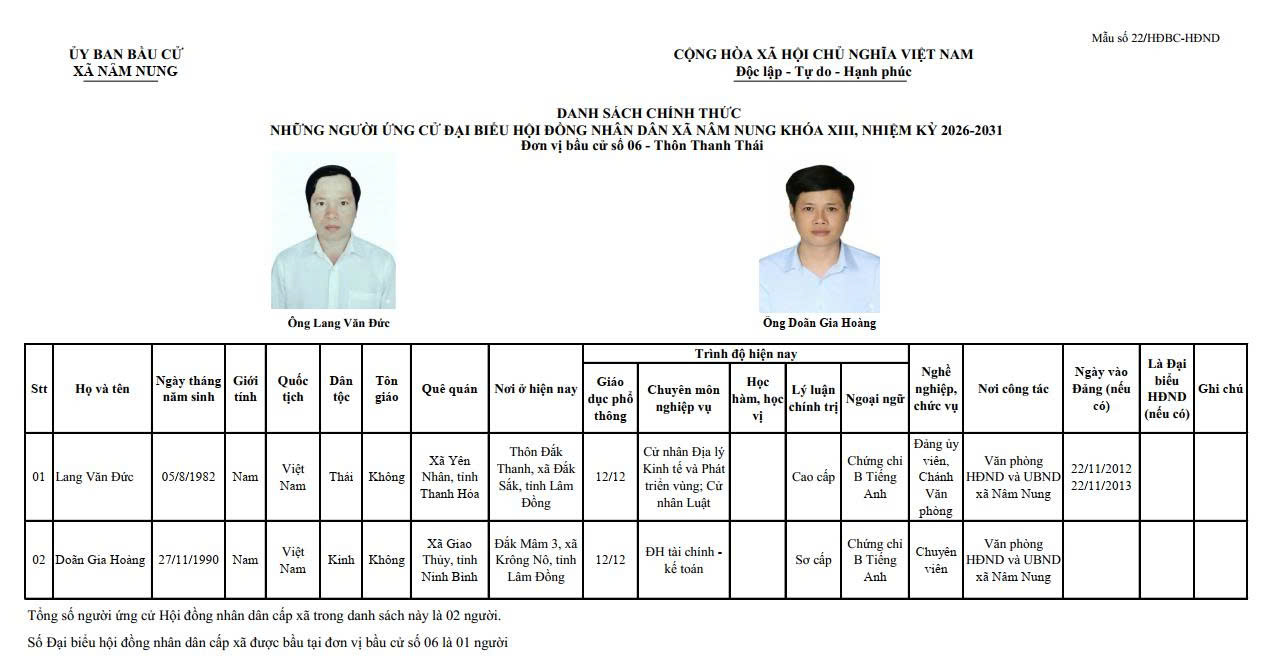 XÃ NÂM NUNG CÔNG BỐ DANH SÁCH CHÍNH THỨC NHỮNG NGƯỜI ỨNG CỬ ĐẠI BIỂU HĐND XÃ KHÓA XIII, NHIỆM KỲ 2026–2031 Ngày 24/02/2026, Ủy ban Bầu cử xã Nâm Nung đã ban hành Nghị quyết số 24/NQ-UBBC về việc công bố danh sách chính thức những người ứng cử đại biểu Hội đồng nhân dân xã khóa XIII, nhiệm kỳ 2026–2031 theo từng đơn vị bầu cử. Việc công bố danh sách căn cứ trên: Luật Bầu cử đại biểu Quốc hội và đại biểu HĐND năm 2015; Luật sửa đổi, bổ sung một số điều của Luật Bầu cử ngày 24/6/2025; Nghị quyết 199/2025/QH15 của Quốc hội về việc rút ngắn nhiệm kỳ và ấn định ngày bầu cử nhiệm kỳ 2026–2031; Nghị quyết 09/NQ-UBBC ngày 23/12/2025 của UBBC xã Nâm Nung; Biên bản Hội nghị hiệp thương lần thứ ba ngày 12/02/2026 của Ủy ban MTTQ Việt Nam xã. 1. Số lượng người ứng cử và số đại biểu được bầu Tổng số người ứng cử đủ tiêu chuẩn: 37 người Tổng số đại biểu HĐND xã được bầu: 23 đại biểu Số đơn vị bầu cử trên địa bàn xã: 14 đơn vị 2. Hiệu lực thi hành Nghị quyết có hiệu lực từ ngày 24/02/2026 – thời điểm được Ủy ban Bầu cử xã Nâm Nung thông qua. Các cơ quan, đơn vị, thành viên các ban bầu cử, tổ bầu cử và các ứng cử viên chịu trách nhiệm thực hiện theo đúng quy định.
